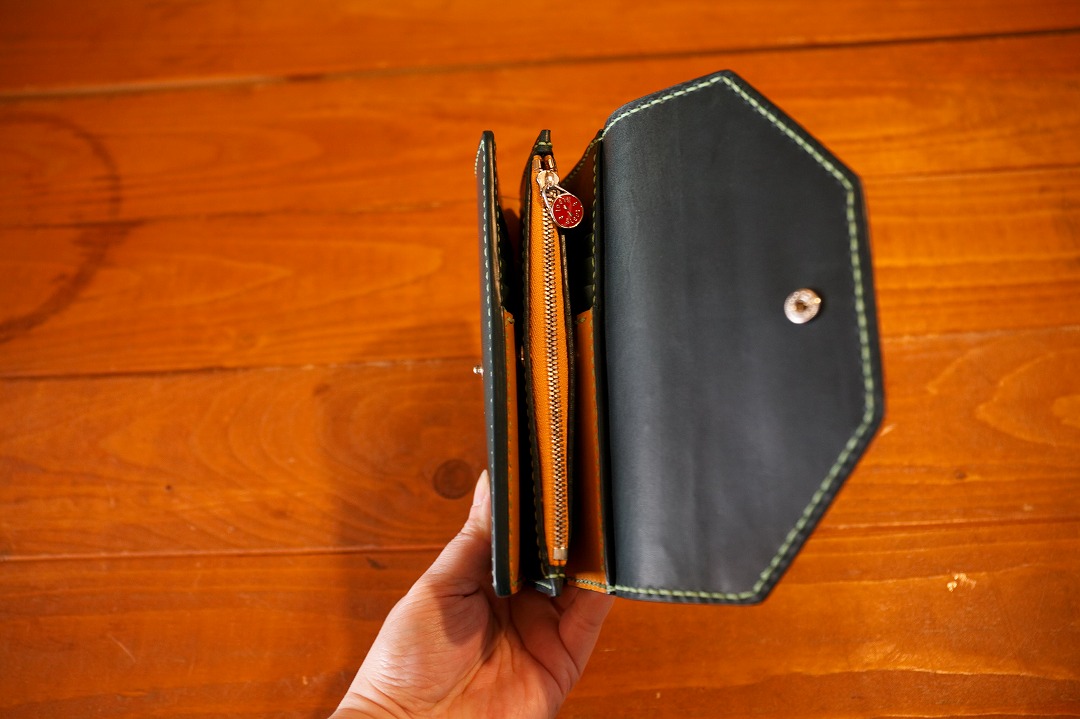 カード仕切りの向きや小銭入れの位置、開き方などが一般的な財布とは異なる作りになっています。